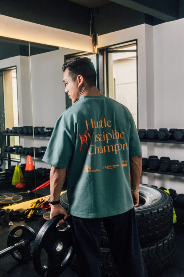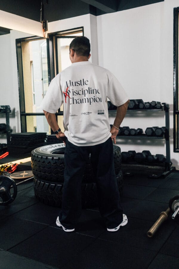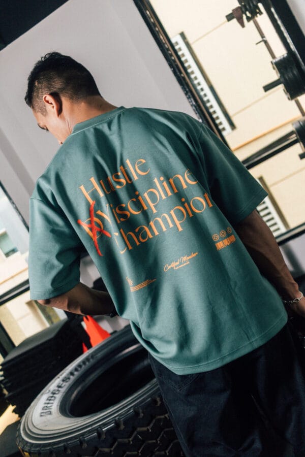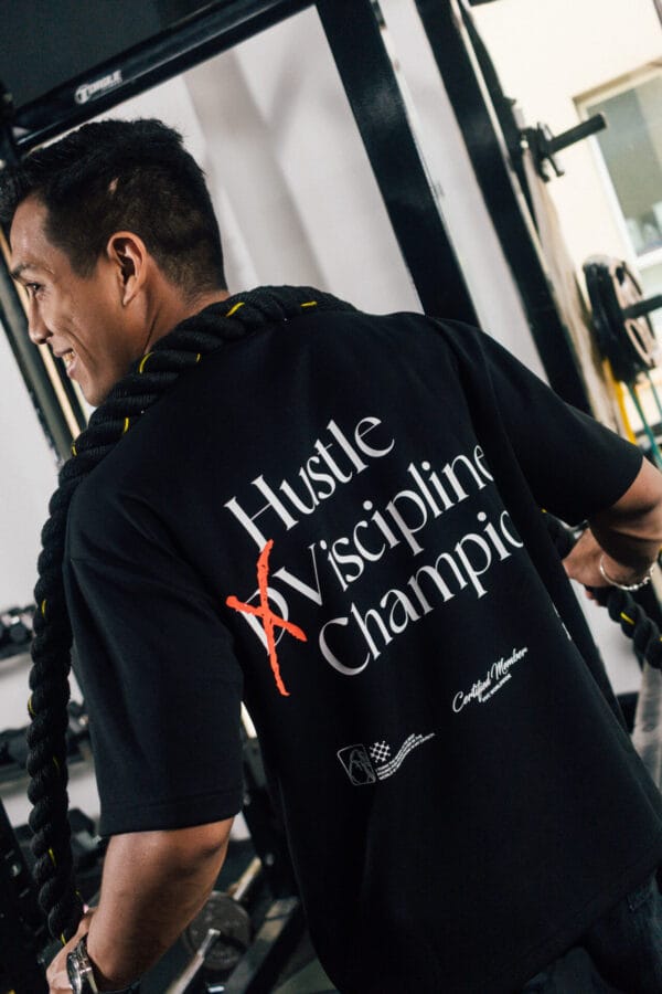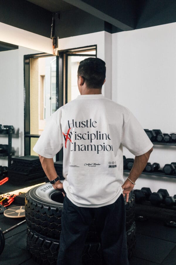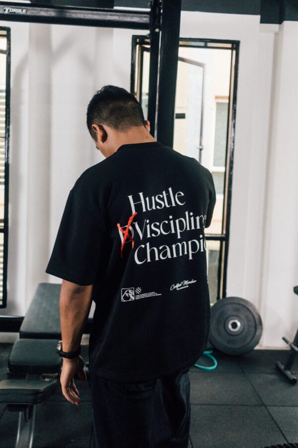 Bold “Hustle × Discipline Champion” back graphic for a strong motivational statement